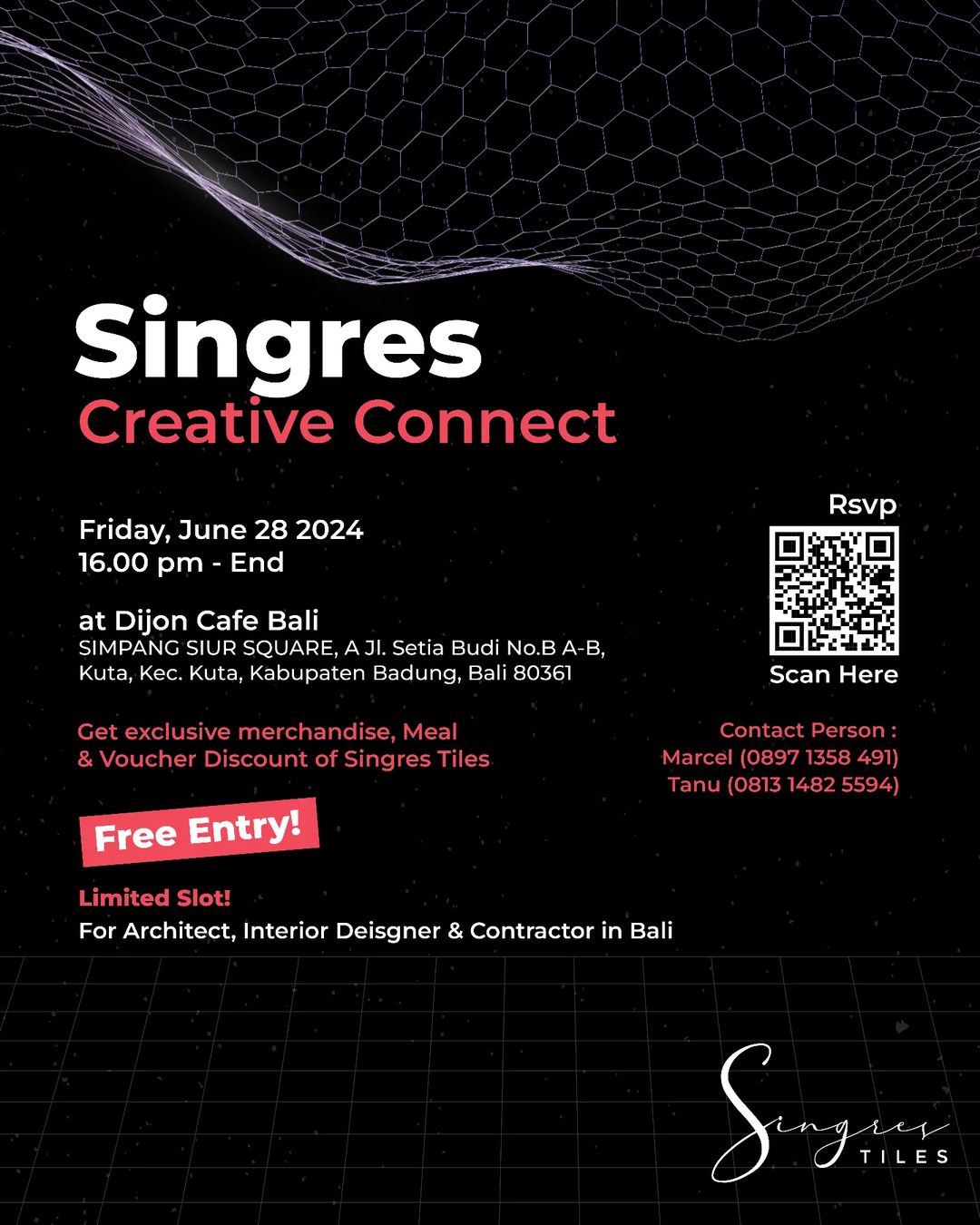 Friday, June 28 2024. 16.00 pm – End. At Dijon Cafe Bali. Join with us, get exclusive merchandise, meal & voucher discount of Singres Tiles.